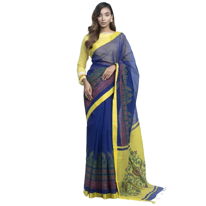 Navy Blue Half Silk Printed & Embroidered Saree
